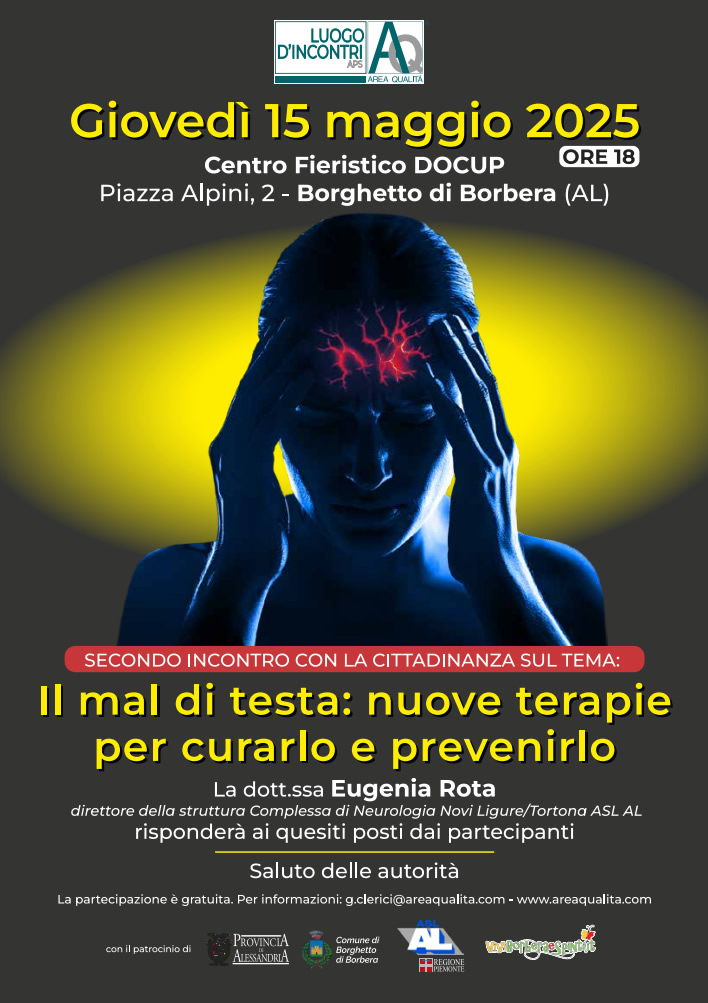 Il prossimo 15 maggio alle ore 18, presso il Centro Fieristico DOCUP, si terrà un Incontro di educazione sanitaria con la cittadinanza dal titolo “Il mal di testa: nuove terapie per curarlo e prevenirlo“. Relatrice dell’evento la dott.ssa Eugenia Rota, direttore della struttura Complessa di Neurologia di Novi Ligure/Tortona ASL, che racconterà di un disturbo molto frequente tra le donne e gli uomini.